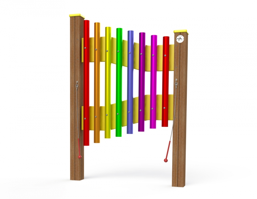 Dit muziekpaneel heeft acht op toon gestemde klankbuizen. Zo sla je niet snel een valse toon aan. De vrolijk gekleurde klankbuizen zijn gemaakt van geadoniseerd aluminium. Samen met de hardhouten staanders met FSC label is dit een zeer duurzaam muziek element. De trommel stokjes zijn bevestigd aan een RVS staalkabeltje dat niet gemakkelijk door te knippen is.
