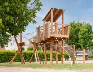 De houten speeltoestel is gemaakt van bilinga. Deze tropische houtsoort is zeer duurzaam en heeft natuurlijk een FSC 100% label.