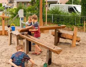 Deze speeltafel is een mooi element in een waterspeelplaats.